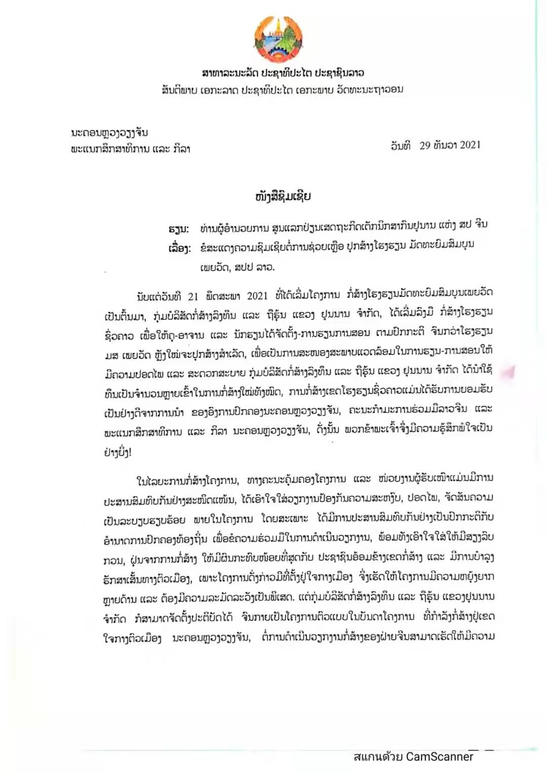 近日,援老撾萬象市皮瓦中學項目先后獲得老中合作委員會、老撾萬象市教育與體育廳兩個重要領導部門的感謝、表揚信。