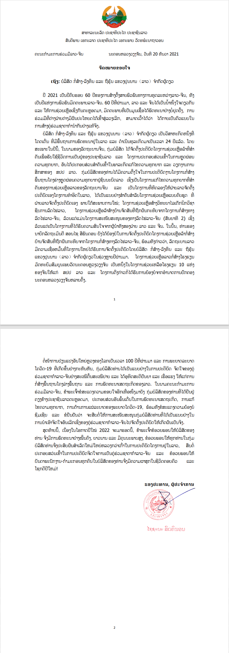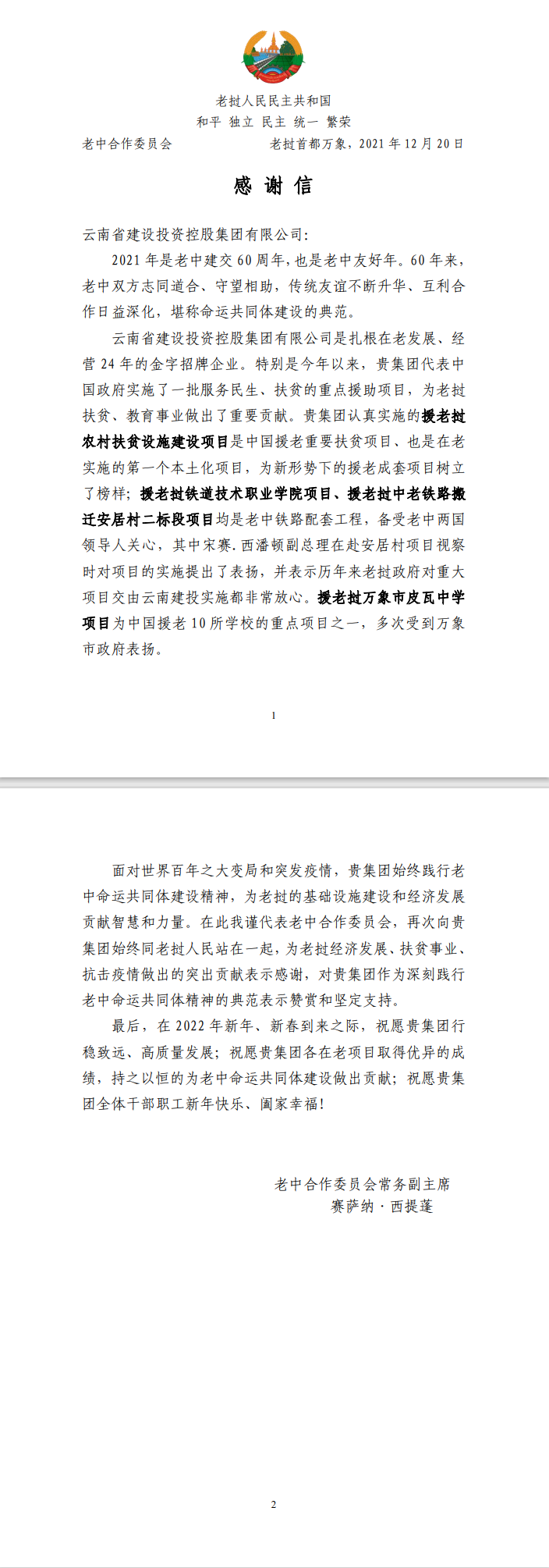 老中合作委員會寫給集團的感謝信中提到,援老撾萬象市皮瓦中學項目為中國援老10所學校的重點項目之一,多次受到萬象市政府表揚。面對世界百年之大變局和突發疫情,集團始終踐行老中命運共同體建設精神,為老撾的基礎設施建設和經濟發展貢獻智慧和力量。老中合作委員會向集團的突出貢獻表示感謝,對集團作為深刻踐行老中命運共同體精神的典范表示贊賞和堅定支持。
