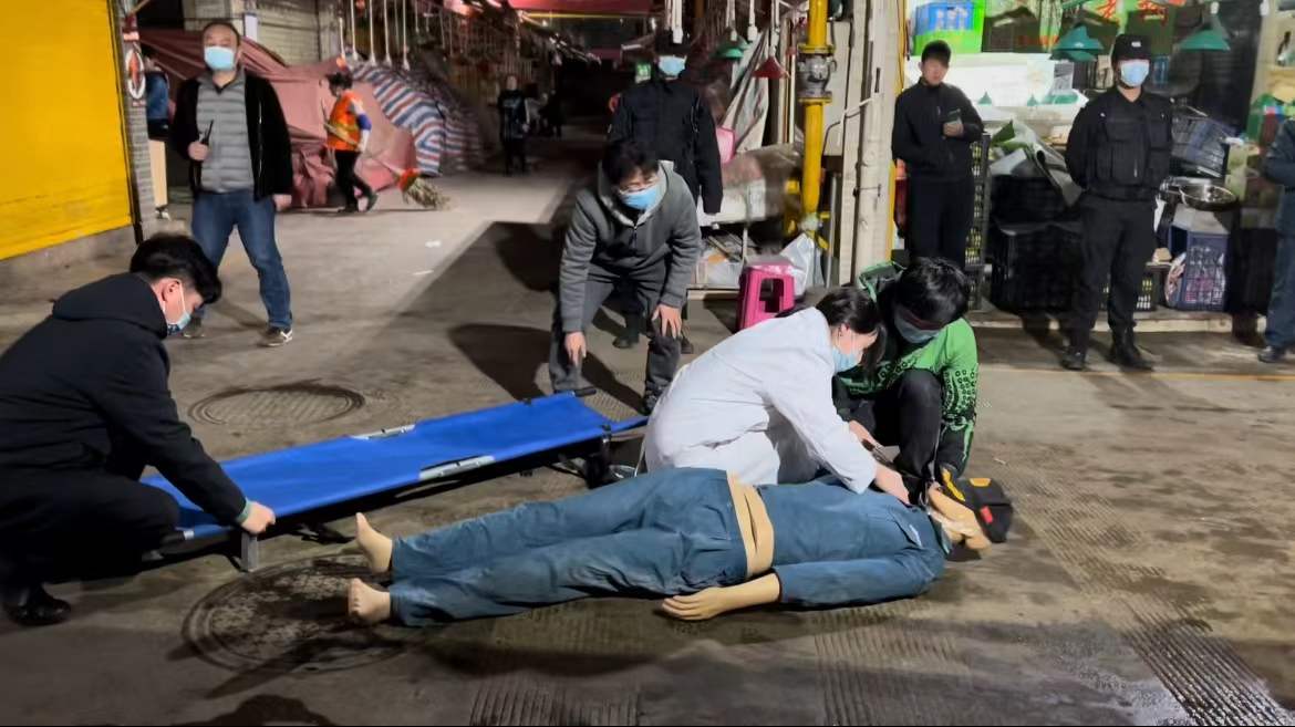 晚上8點,消防應急疏散演練正式開始。假設4道10-11號起火,模擬現場煙霧彌漫,火勢向兩側蔓延。商戶電話通知市場管理人員報警,市場管理辦公室接到報警后,第一時間啟動消防應急預案,成立現場指揮部,各應急救援小組迅速集合待命。在總指揮安排下,通訊組撥打“119”“120”電話報警求助,滅火組做好防護立即前往現場進行初期火災撲救。后勤保障組播放應急疏散廣播并切斷4幢電閘。警戒組組織人員布置警戒線,嚴防無關人員擅入火災事故現場,疏散組迅速疏散人群。現場火勢撲滅后,滅火組立即對現場進行偵察,發現有一名手臂受傷的商戶并將此情況報告總指揮。隨后,醫療救護組接到指令立即趕到現場救治傷員。