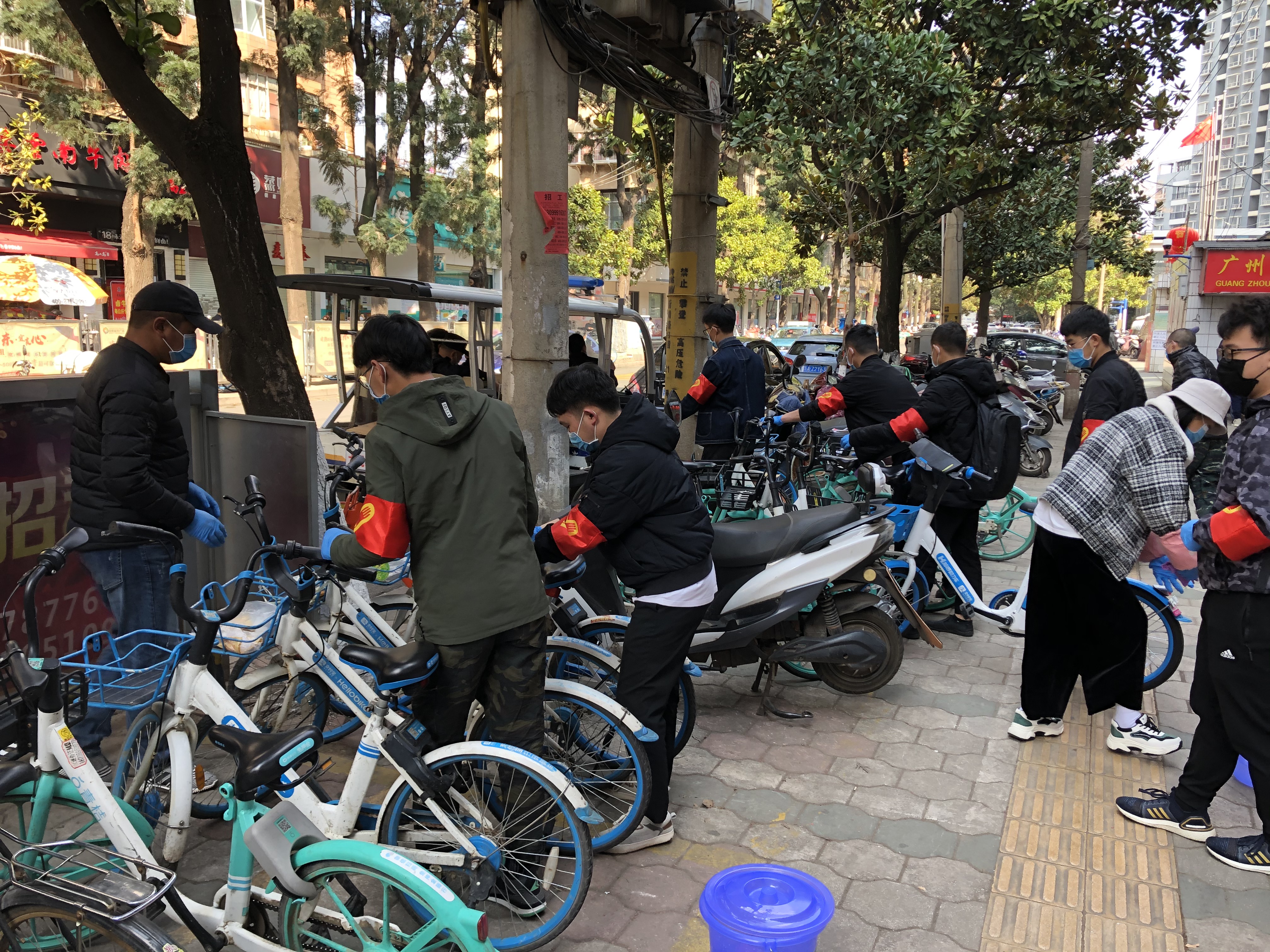 團青們也用實際行動踐行雷鋒精神。在人流量較多大觀路和新聞路旁,戴上志愿服務袖標,團青們搖身一變成了共享單車“整理員”、“清潔員”。男生在前將單車有序整理停放,清理單車籃內的塑料、紙屑垃圾;女生隨后拎著水桶、抹布,用消毒水細致地擦除把手、座位上的污漬,減少了交叉接觸的風險。清理過后,“青黃籃”各色的共享單車整齊地停放在路邊,干凈又整潔。