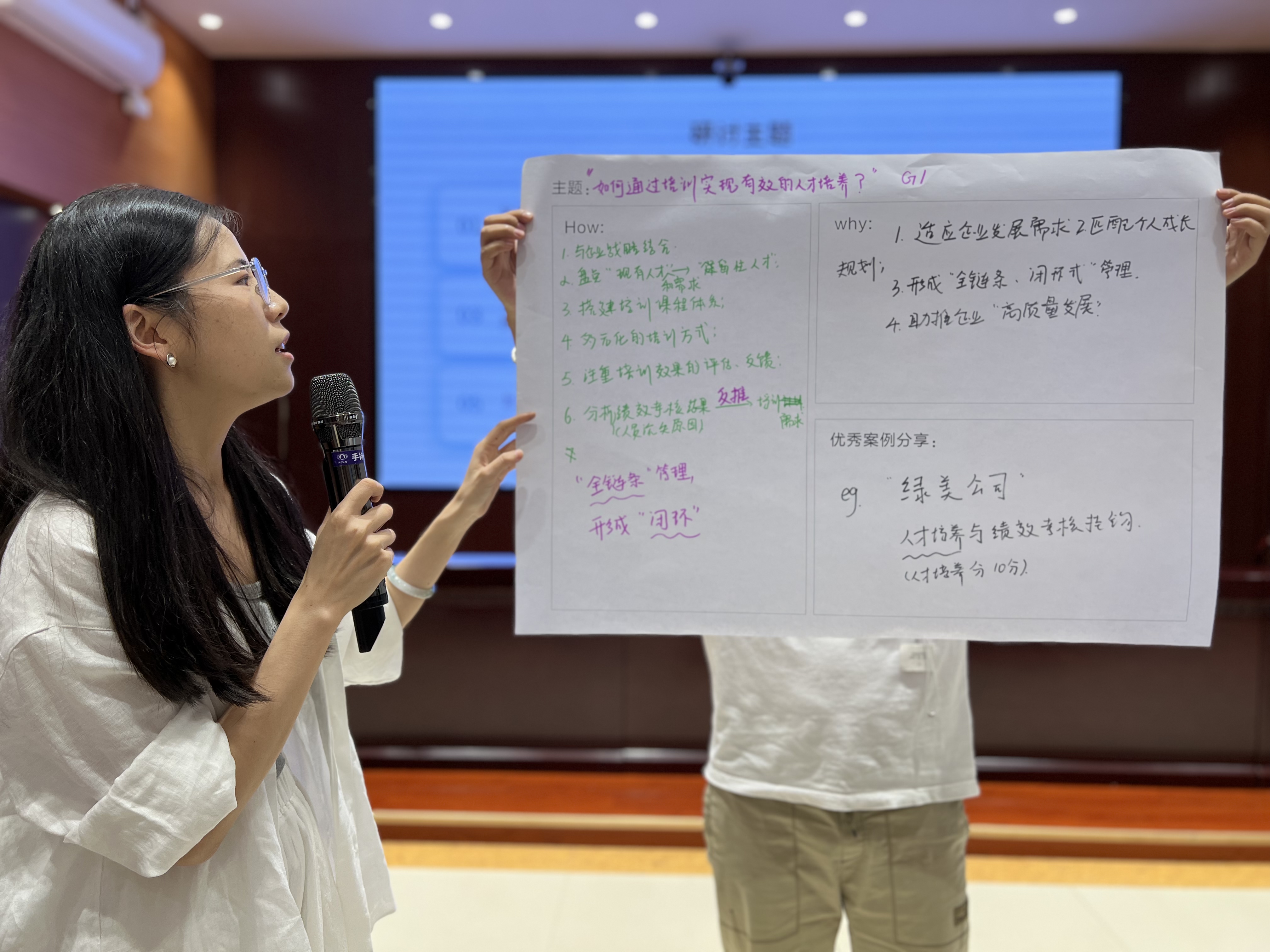 研討活動(dòng)中,各小組從“人才培養(yǎng)和人才盤點(diǎn)、培訓(xùn)成本控制和培訓(xùn)資源優(yōu)化配置、培訓(xùn)項(xiàng)目品牌建設(shè)與推廣、人才梯隊(duì)建設(shè)和內(nèi)訓(xùn)師隊(duì)伍建設(shè)”等維度展開主題研討,從不同角度、不同層次總結(jié)觀點(diǎn)和結(jié)論,并將成果繪制在海報(bào)上,輪流上臺(tái)展示。過程中,大家暢所欲言、各抒己見,以思維碰撞共同發(fā)揮集體智慧,將本次研討活動(dòng)推向新的高潮,活動(dòng)取得了預(yù)期效果目標(biāo)。