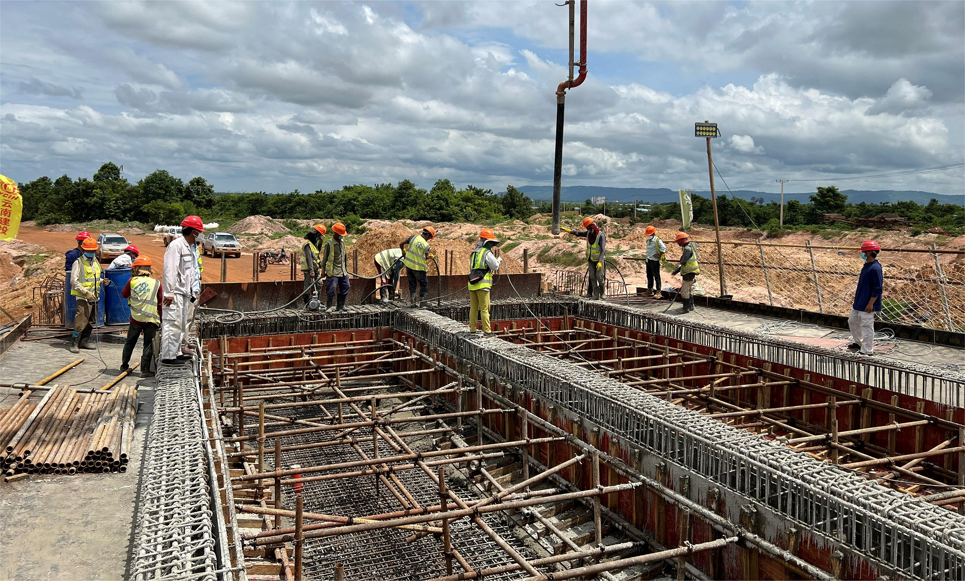 7月15日下午,伴隨著最后一方混凝土入模,路橋市政直管一部承建的柬埔寨暹粒吳哥國際機場建設項目樓前高架橋梁第九聯箱梁完成底板及腹板混凝土澆筑。