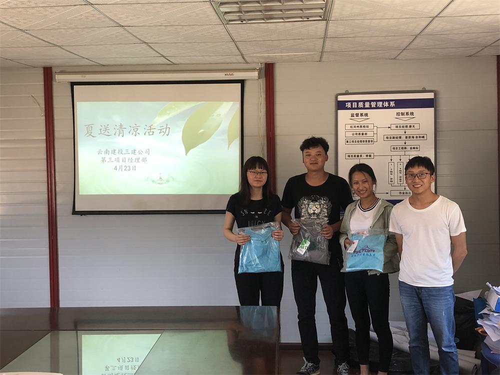 4月23日,公司第三項目經(jīng)理部開展夏送清涼活動,分別在蒙自項目部及彌勒項目部發(fā)送防曬服,減少紫外線對項目工作人員皮膚的傷害,讓他們在工作的時候多一份清涼。????????????????????????????????????????????????????????鄒光華攝影報道